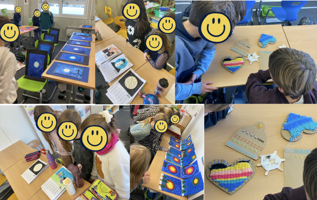 Mit viel Fantasie und Freude am Gestalten entstanden beeindruckende Kunstwerke. Die Kinder malten farbenfrohe Bilder mit Ölkreide, experimentierten kreativ mit Nadel und Faden beim Weben und gestalteten mit großem Ideenreichtum einen Kalender, der sie durch das Jahr begleitet.